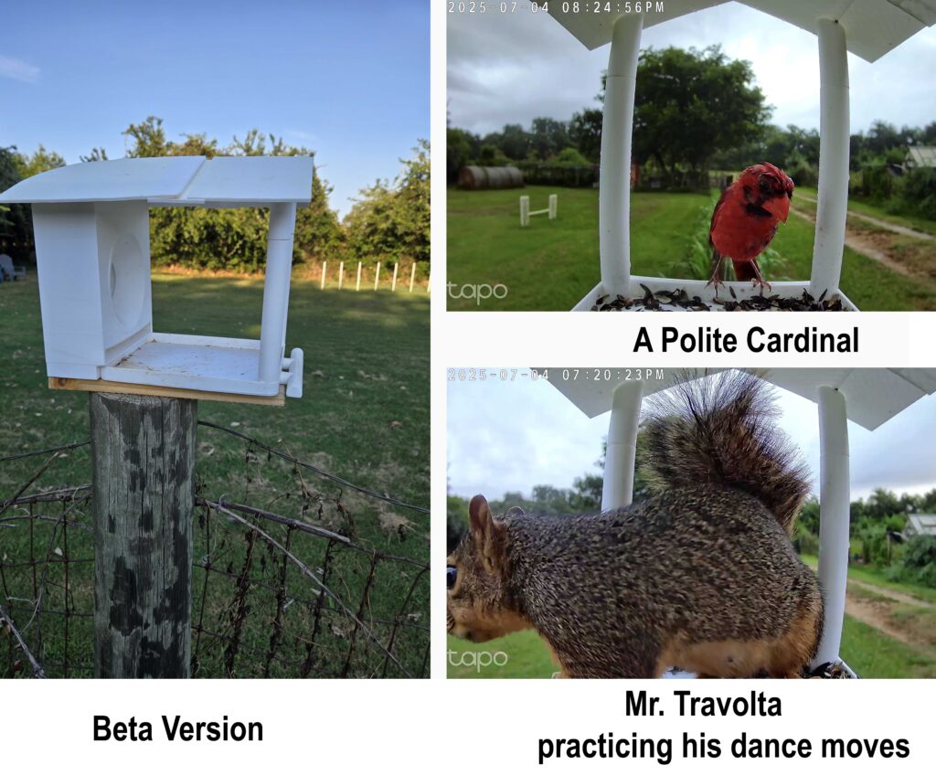 The squirrels were happy. The cardinals were happy. The pictures looked good. I was feeling smug. But… the feed still needed weather protection, and an automatic feeder would make me feel like a genius.