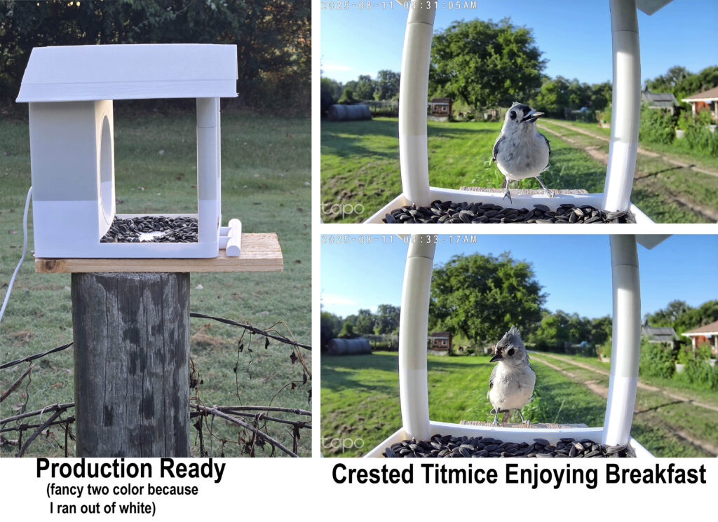 Now? The feeder station is officially production-ready. Easy to fabricate. Dirt cheap. Uses a budget security camera. Never mind that I only need one. This is why you never give an engineer unlimited budget and no deadlines—we’ll keep “improving” things until the sun burns out.