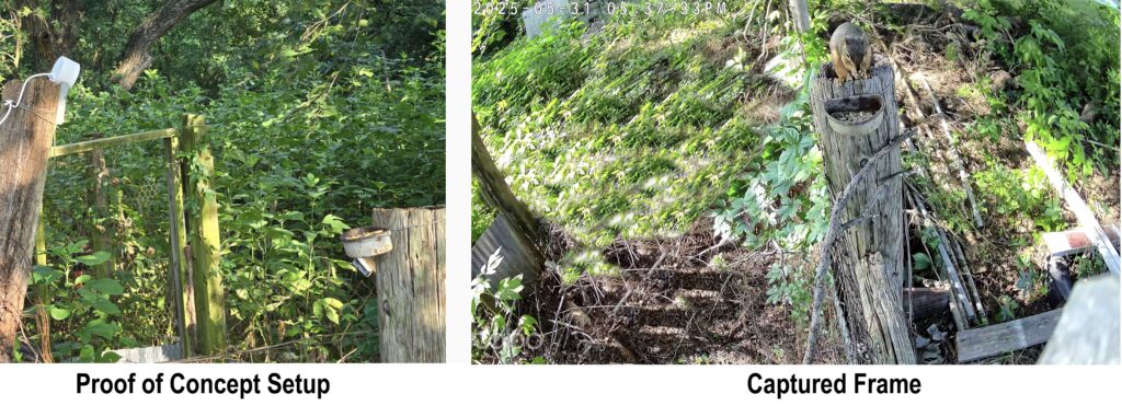 Step one: proof of concept. Could I actually capture squirrels feeding? One security camera, one battered feed cup filled with sunflower seeds, and boom—mission accomplished. Proof of concept also exists to reveal where the wheels might come off. And boy, did they. The squirrel took up maybe five pixels in the entire frame. When I moved the camera closer, everything went blurry, because security cameras are designed to focus on things like “infinity” and not “close-up squirrel glamour shots.”